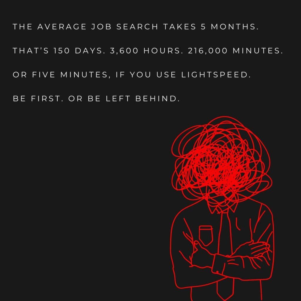 The average job search takes five months. That is 150 days of searching. 3,600 hours lost. Or you could spend five minutes finding the right job and applying before the crowd.